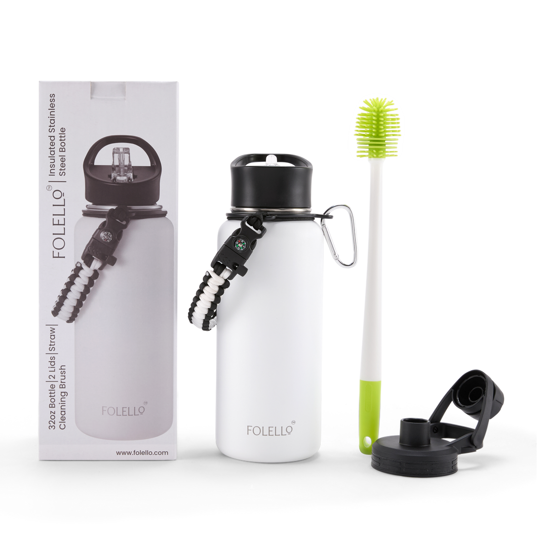 FOLELLO 1L Thermos Steel Double Layer Vacuum Insulated Water Bottle | Keeps Drinks Hot for 12 Hours & Cold for 24 Hours | Includes Rope, Compass, Carabiner, 2 Lids (Straw Lid & Flip-Up Spout Sports Cap) | Perfect for Outdoor | Elegante White