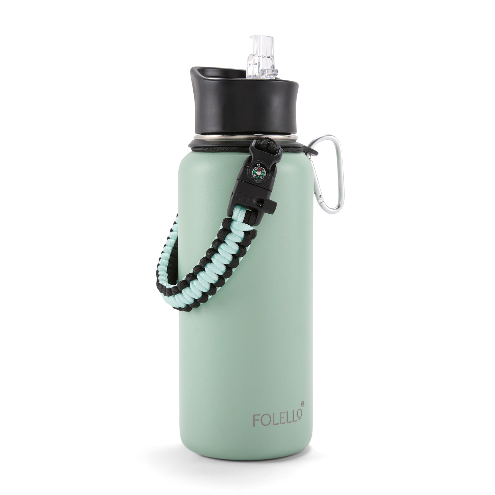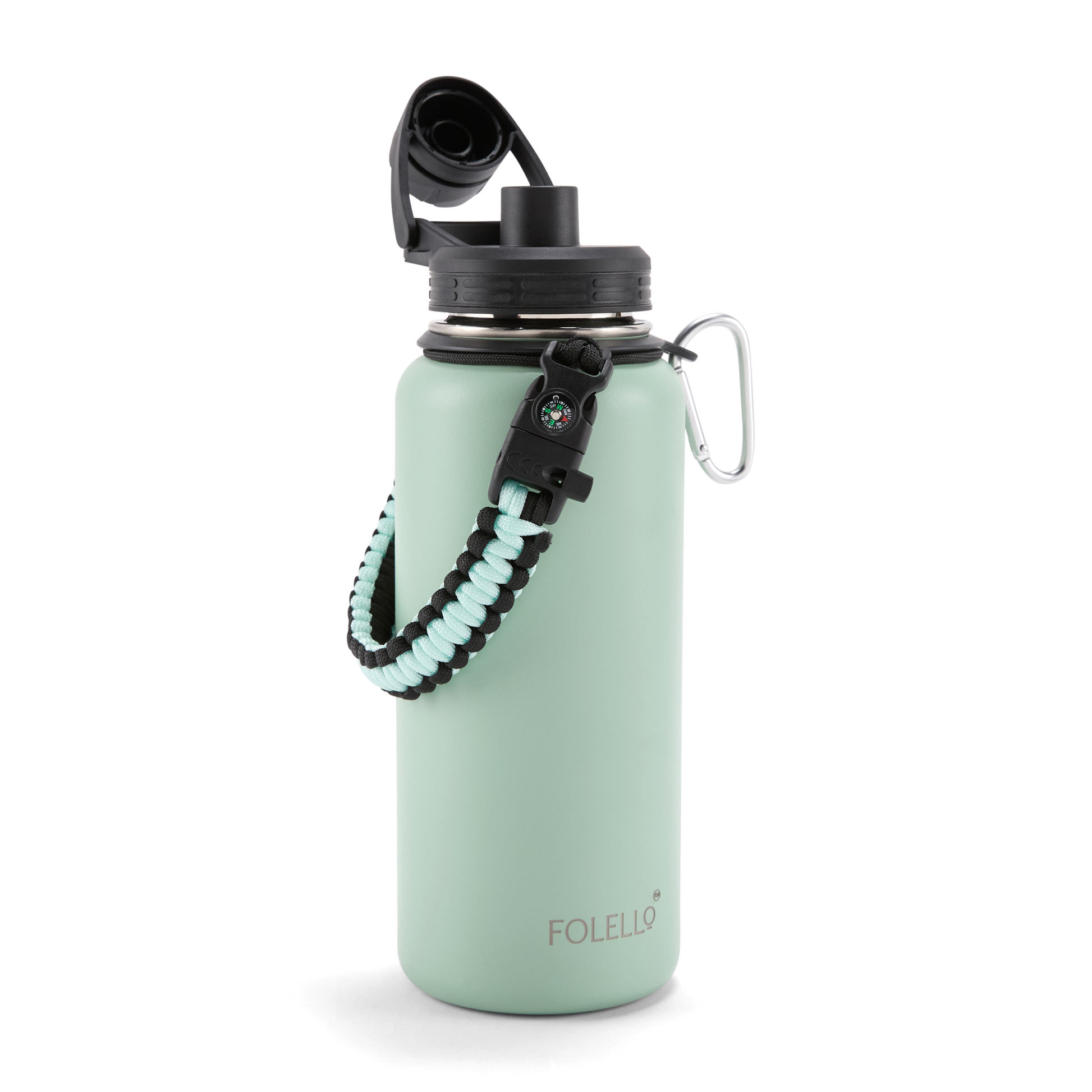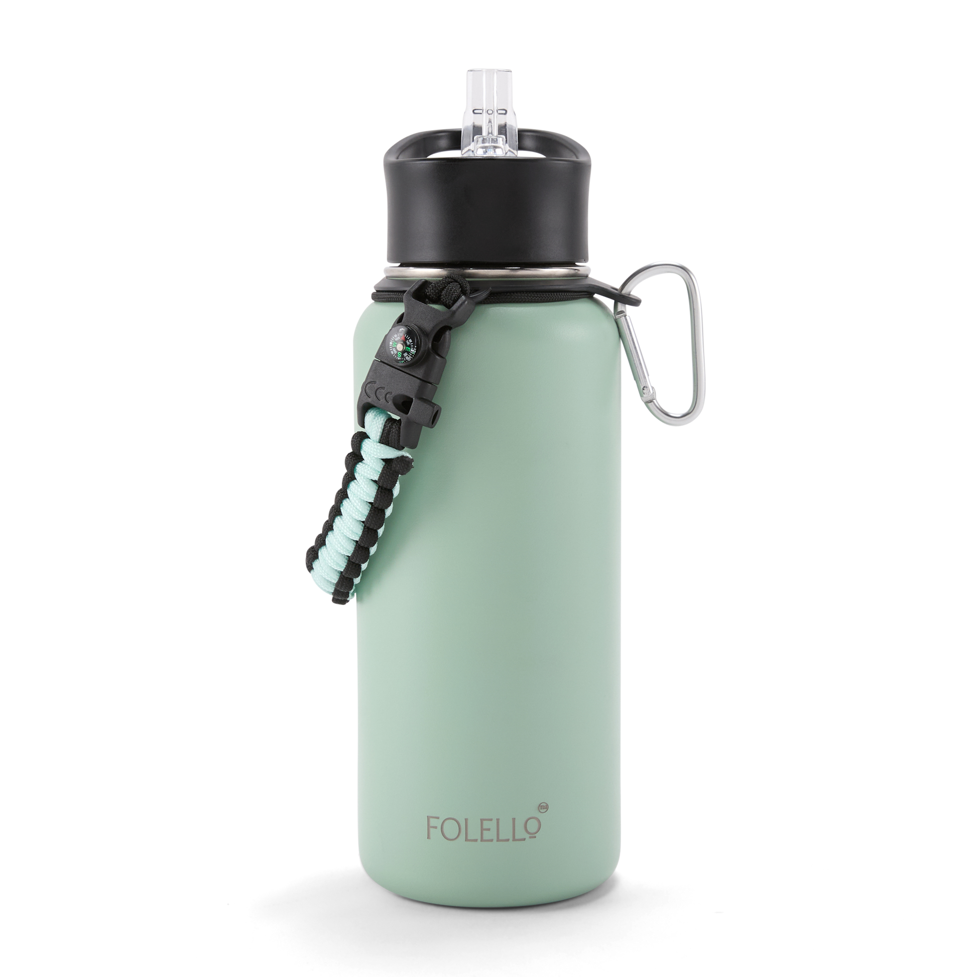 Folello 1L Thermos Steel Double Layer Vacuum Insulated Water Bottle | Keeps Drinks Hot for 12 Hours & Cold for 24 Hours | Includes Rope, Compass, Carabiner, 2 Lids (Straw & Flip-Up Spout) | Full-Length Steel Fruit Infuser | Detox Bottle | Mint Green