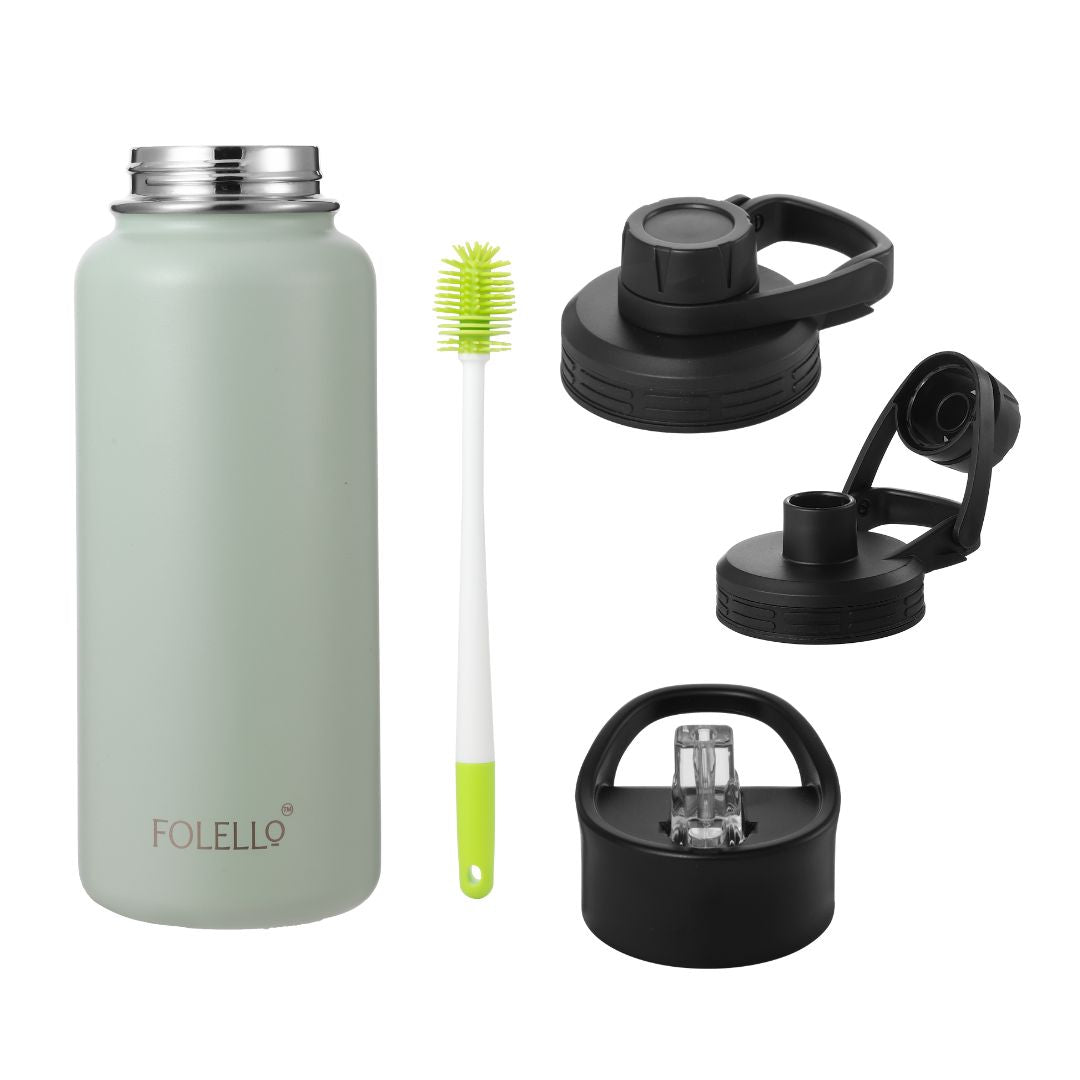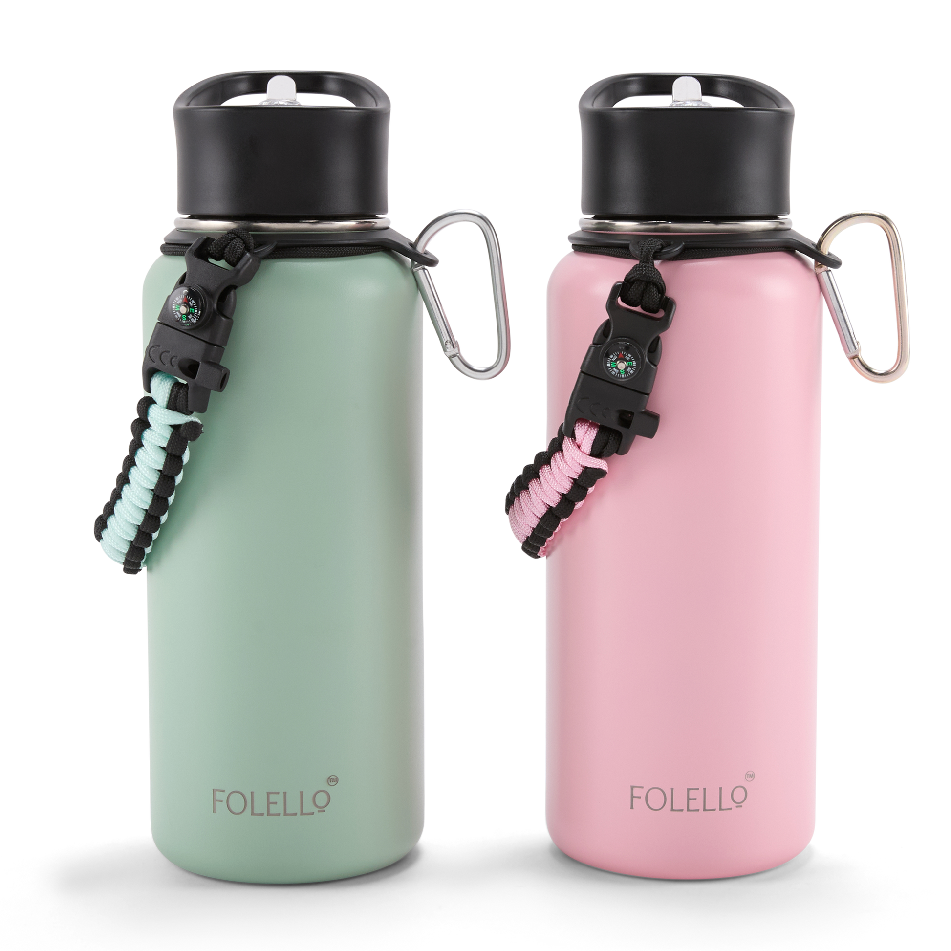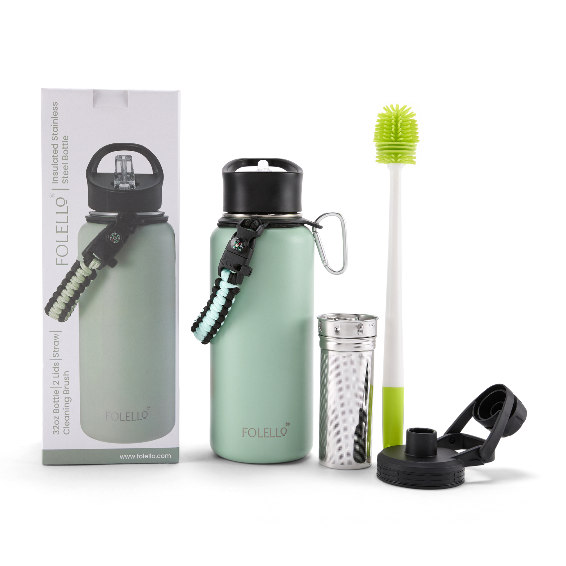 Folello 1L Thermos Steel Double Layer Vacuum Insulated Water Bottle | Keeps Drinks Hot for 12 Hours & Cold for 24 Hours | Includes Rope, Compass, Carabiner, 2 Lids (Straw & Flip-Up Spout) | Full-Length Steel Fruit Infuser | Detox Bottle | Mint Green