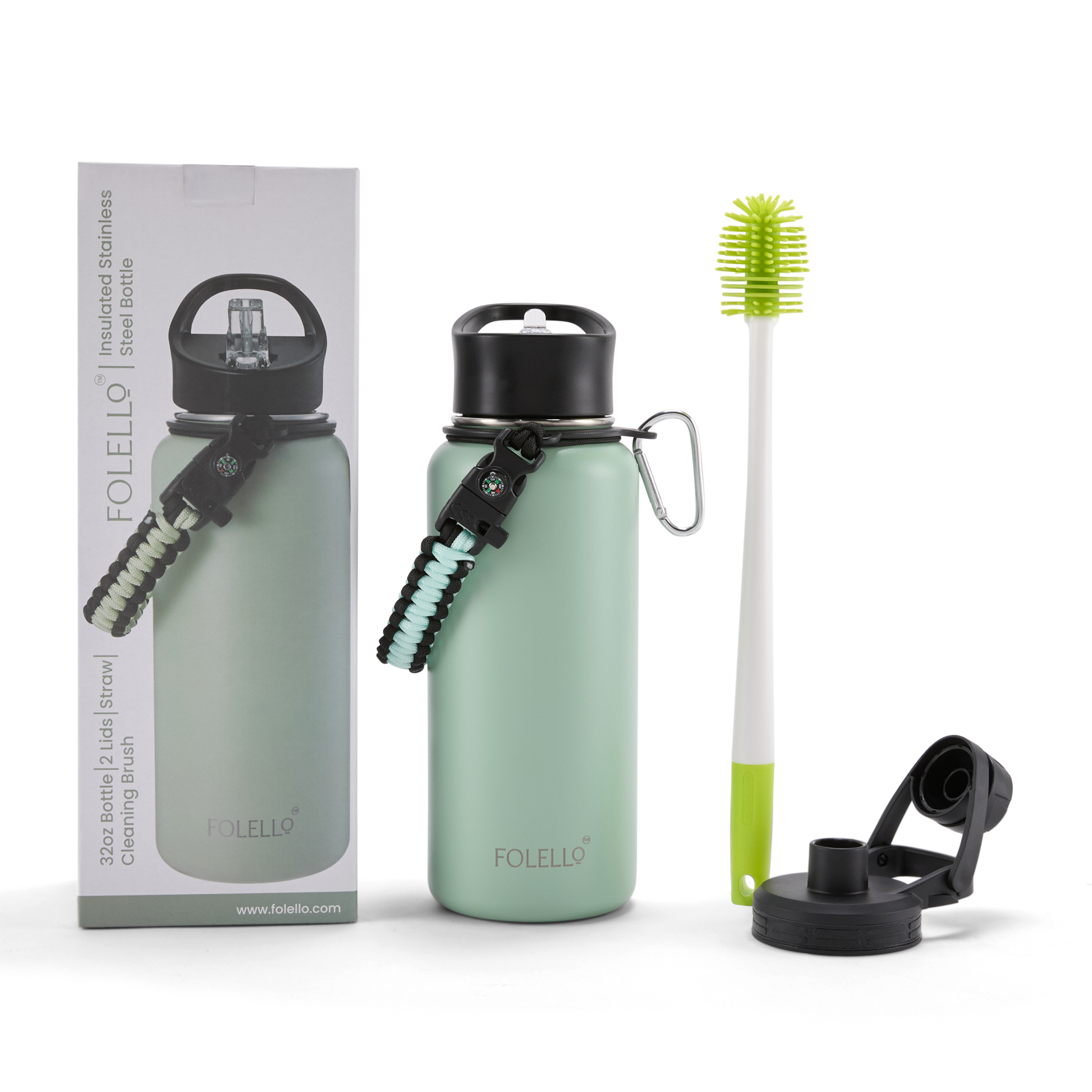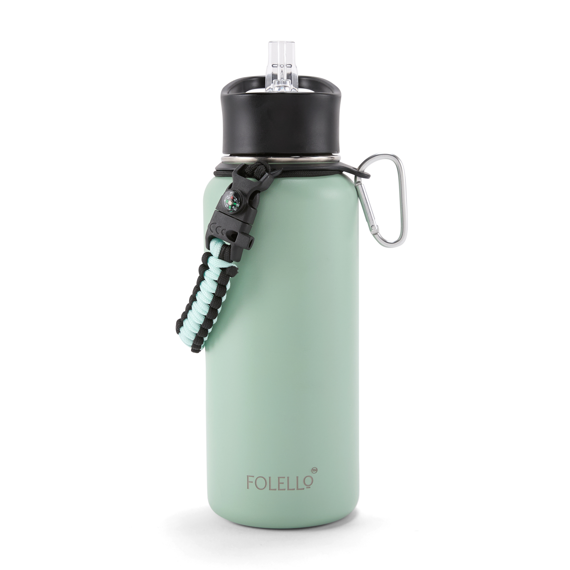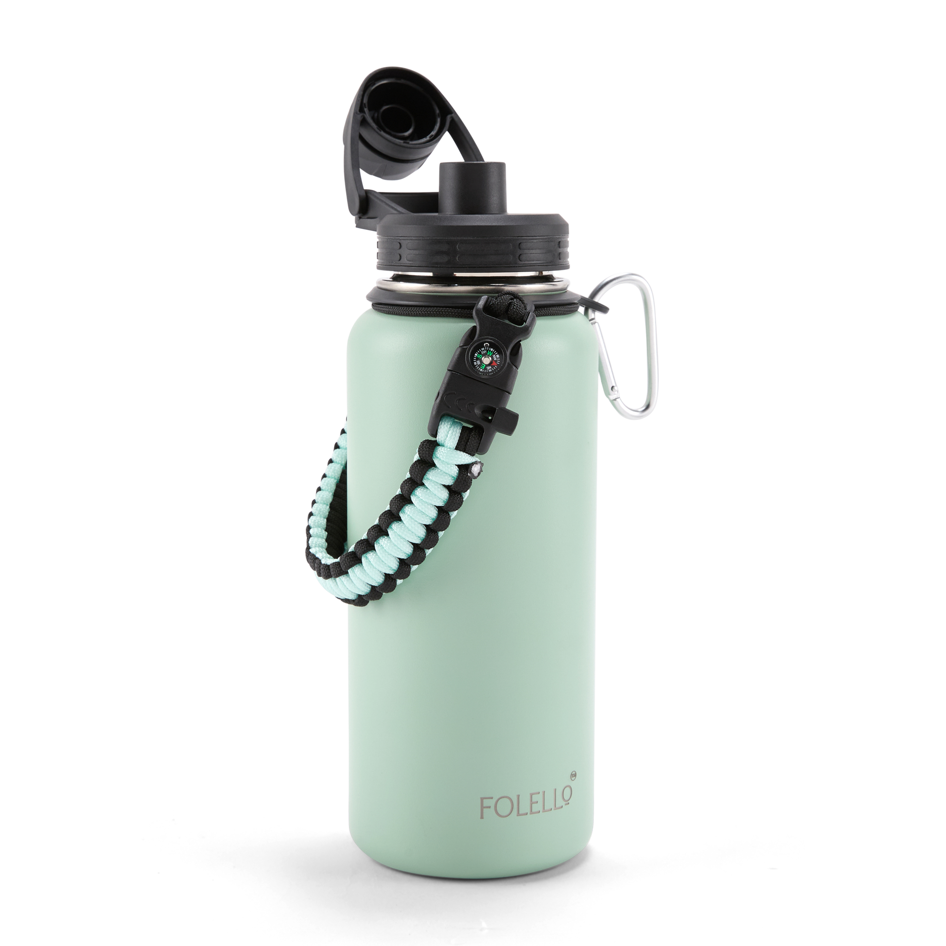 FOLELLO 1L Thermos Steel Double Layer Vacuum Insulated Water Bottle | Keeps Drinks Hot for 12 Hours & Cold for 24 Hours | Includes Rope, Compass, Carabiner, 2 Lids (Straw Lid & Flip-Up Spout Sports Cap) | Perfect for Outdoor | Refreshing Mint Green